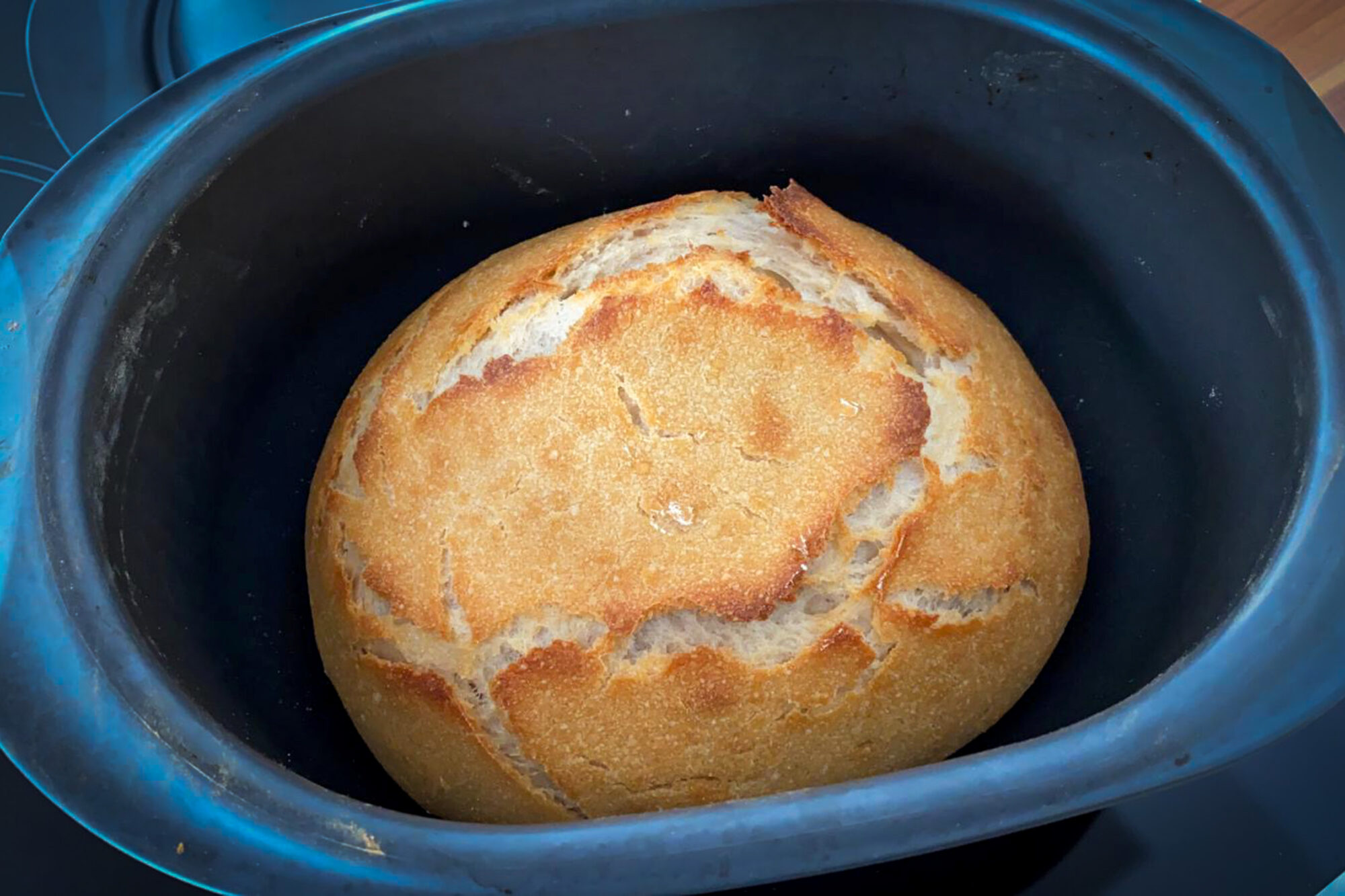 - Den Teig zu einer runden und flachen Scheibe formen, die Ränder an fünf Stellen rundherum nach innen falten und die so entstandene Kugel umgedreht in einem Brotbacktopf abgedeckt nochmals eine Stunde ruhen lassen.